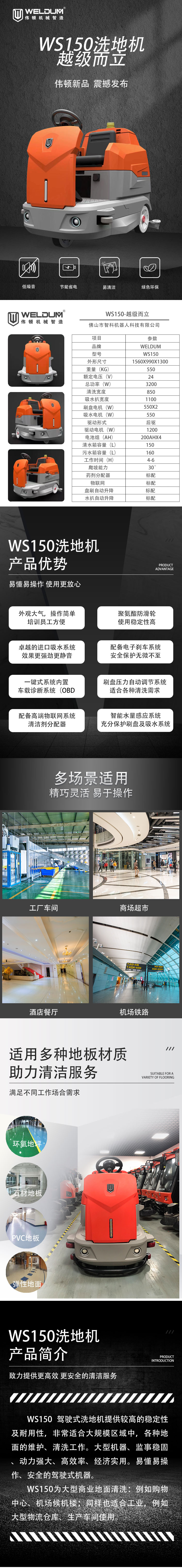 WS150駕駛式洗地機提供較高的穩定性及耐用性,非常適合大規模區域中,各種地面的維護、清洗工作。大型機器、監事穩固、動力強大、高效率、經濟實用。易懂易操作、安全的駕駛式機器。。